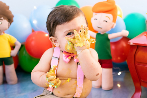 Já vimos bebês tímidos chegarem todo acanhado e por fim acabar curtindo o ensaio, o bolo e render fotos lindas e cheias de sorrisos! Assim como bebês que são mais risonhos, segundo os pais, acabar estranhando o ambiente, ficar com medo do bolo e não querer sorrir para as fotos. Mas se isso acontecer e o seu bebê for do tipo mais sério, ou não querer sorrir, não é um problema, essas fotos também são cheias de significado e carregam as características especiais e únicas de cada bebê.